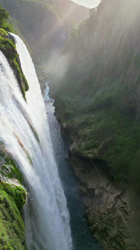 Home » Shop » 1 Video » Video – Aerial drone view of Tamul Waterfall cascading down green cliffs into a turquoise pool below. Vertical