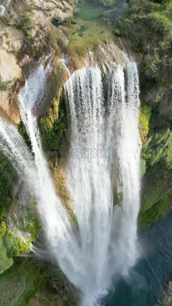 Aerial drone view of Tamul Waterfall cascading down green cliffs into a turquoise pool below. Vertical Royalty Free Stock Video Footage