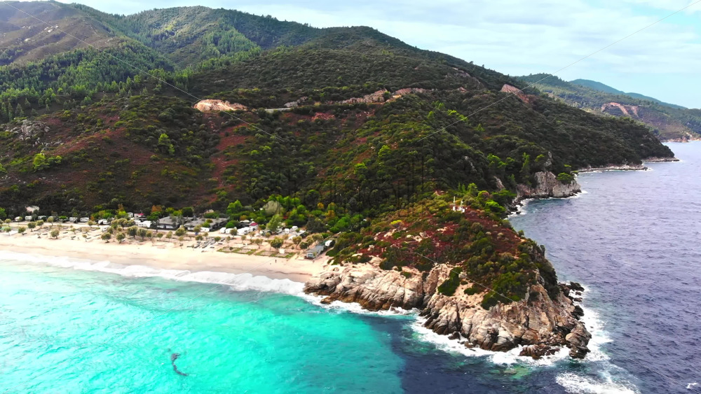 Aerial drone view of the Aegean sea coast with camping near the beach, multiple greenery, hills on the background, blue water with waves. Greece Royalty Free Stock Video Footage