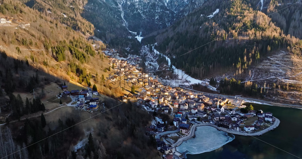 video Aerial drone view of the Alleghe village with Lake Alleghe, in the province of Belluno, Dolomites, Italy Royalty Free Stock Video Footage