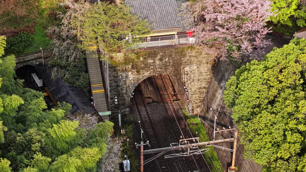 video Aerial drone view of a train moving through the Arashiyama train station, Kyoto, Japan in daylight Royalty Free Stock Video Footage