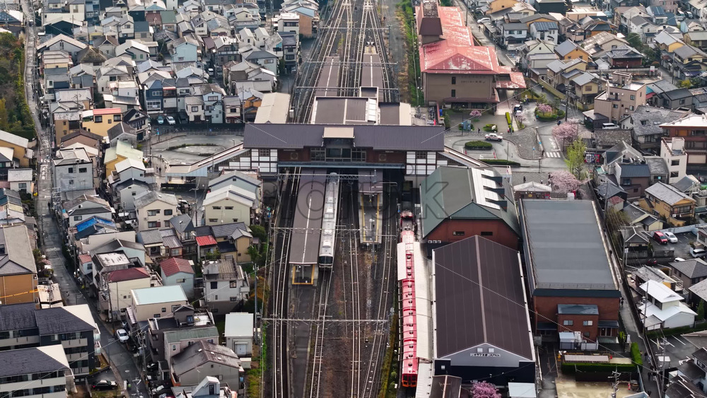 video Aerial drone view of a train moving through the Arashiyama train station, Kyoto, Japan in daylight Royalty Free Stock Video Footage