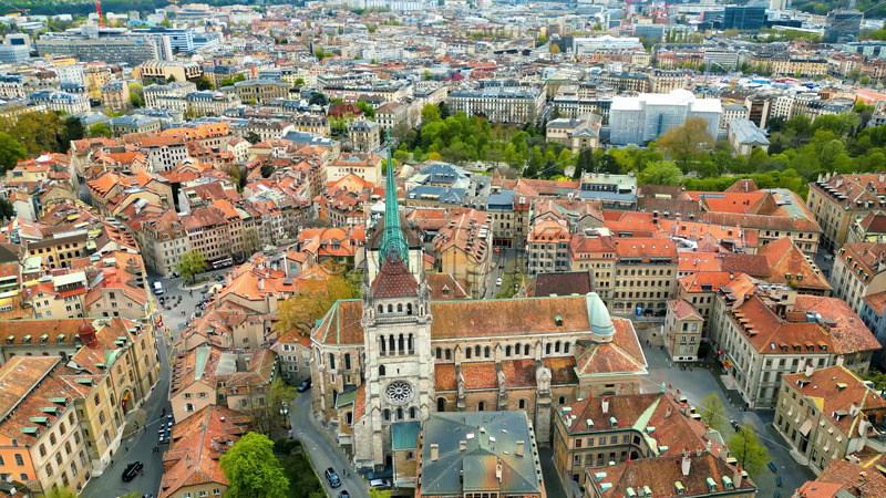 VIDEO Aerial, drone view of the buildings surrounding the St Pierre Cathedral in Geneva, Switzerland Royalty Free Stock Video Footage