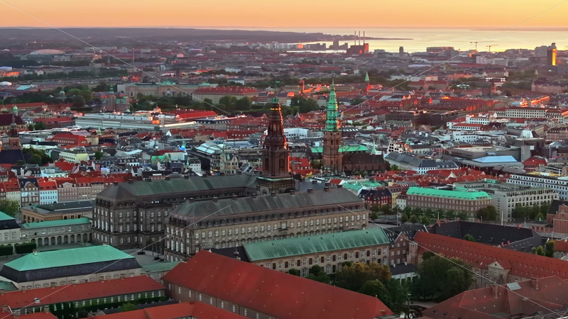 VIDEO Aerial drone view of the Christiansborg Palace on the islet of Slotsholmen in central Copenhagen, Denmark at sunset Royalty Free Stock Video Footage