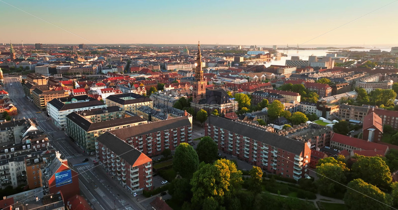 VIDEO Aerial drone view of the Church of Our Saviour in the city centre of Copenhagen, Denmark at sunset Royalty Free Stock Video Footage