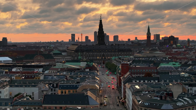 Video Aerial drone view of the Nyhavn waterfront, canal and entertainment district in Copenhagen, Denmark in the evening Royalty Free Stock Video Footage