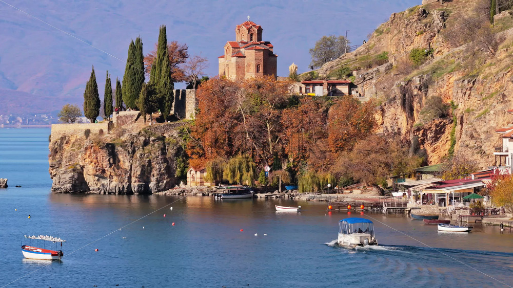 Aerial drone view of the iconic St. John the Theologian Church perched above Lake Ohrid, framed by cypress trees and autumn colors. North Macedonia Royalty Free Stock Video Footage