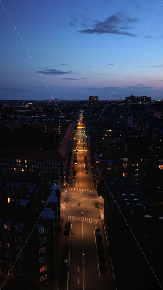 Aerial drone view of Copenhagen with a long illuminated street leading into the city, while tall modern skyscrapers rise in the distance against the twilight sky. Vertical Royalty Free Stock Video Footage