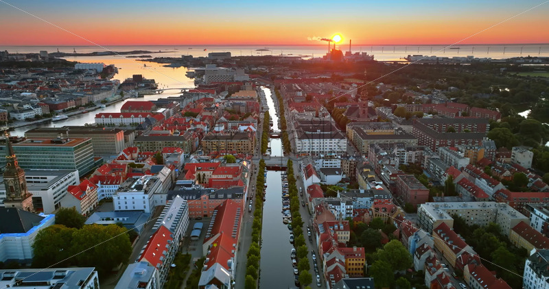 VIDEO Aerial drone view of Amagerbro area in the northern part of the island Amager in Copenhagen, Denmark at sunset Royalty Free Stock Video Footage