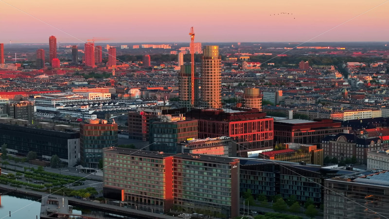 Video Aerial drone view of the city centre of Copenhagen, Denmark at sunset