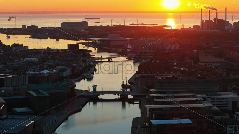 VIDEO Aerial drone view of Amagerbro area in the northern part of the island Amager in Copenhagen, Denmark at sunset Royalty Free Stock Video Footage