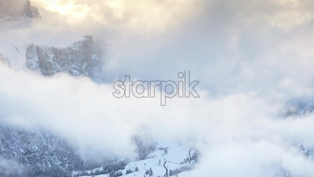 video Aerial drone view of the Colfosco mountain village covered in snow, in South Tyrol, Dolomites, Northern Italy