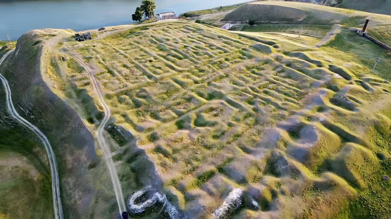 Aerial drone view of the Danube River flowing through the Iron Gates Gorge along the Romania Serbia border. The wide river curves around a forested island, surrounded by agricultural fields and rolling hills Royalty Free Stock Video Footage