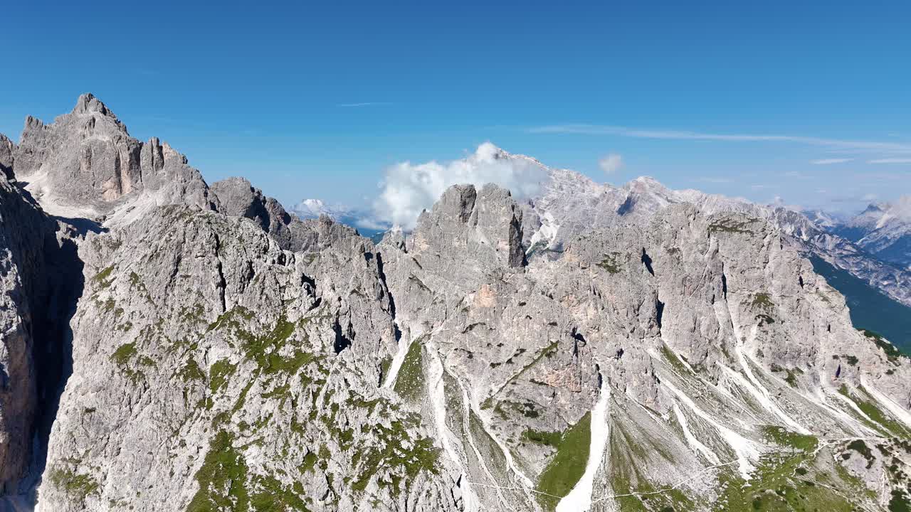 Aerial drone view of the dramatic Dolomites mountain range with steep grey cliffs and alpine valleys below. Clouds drift over the rugged peaks of northern Italy Royalty Free Stock Video Footage