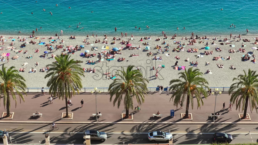 Aerial drone view of crowded Nice beach with people sunbathing on pebbles and swimming in turquoise Mediterranean waters. Vertical, Nice, France Royalty Free Stock Video Footage