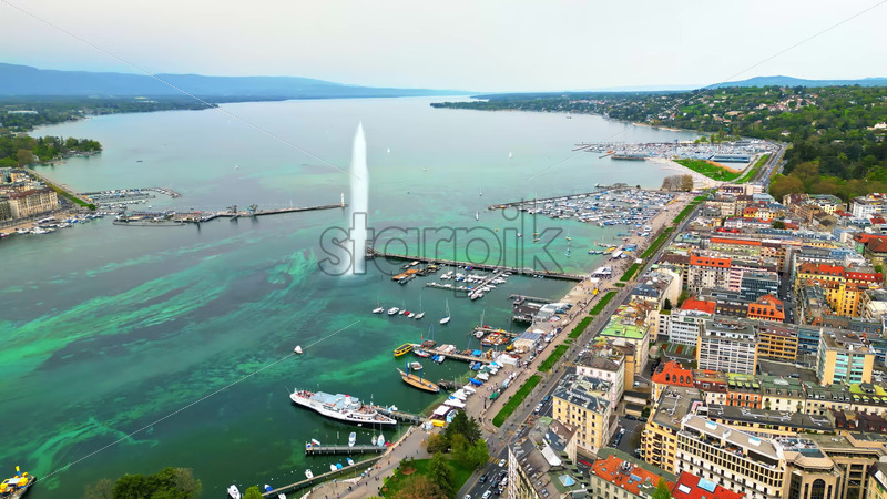 VIDEO Aerial, drone view of the Geneva Water Fountain in Switzerland Royalty Free Stock Video Footage