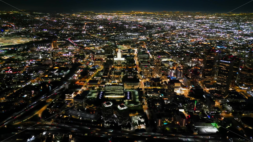 Aerial drone view of downtown Los Angeles illuminated at night Royalty Free Stock Video Footage