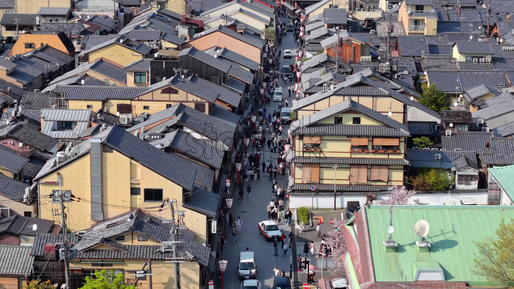 video Aerial drone view of the Hanamikoji Street in Kyoto, Japan in daylight Royalty Free Stock Video Footage