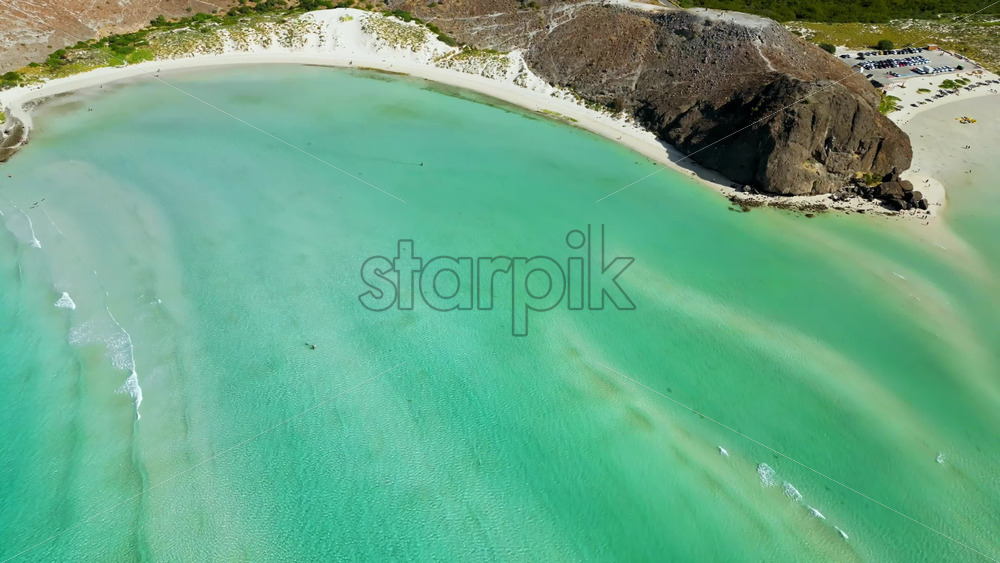 Aerial drone view of the iconic Balandra Bay with its turquoise lagoon, white sand beaches, and rocky desert surroundings in Baja California Sur, Mexico Royalty Free Stock Video Footage