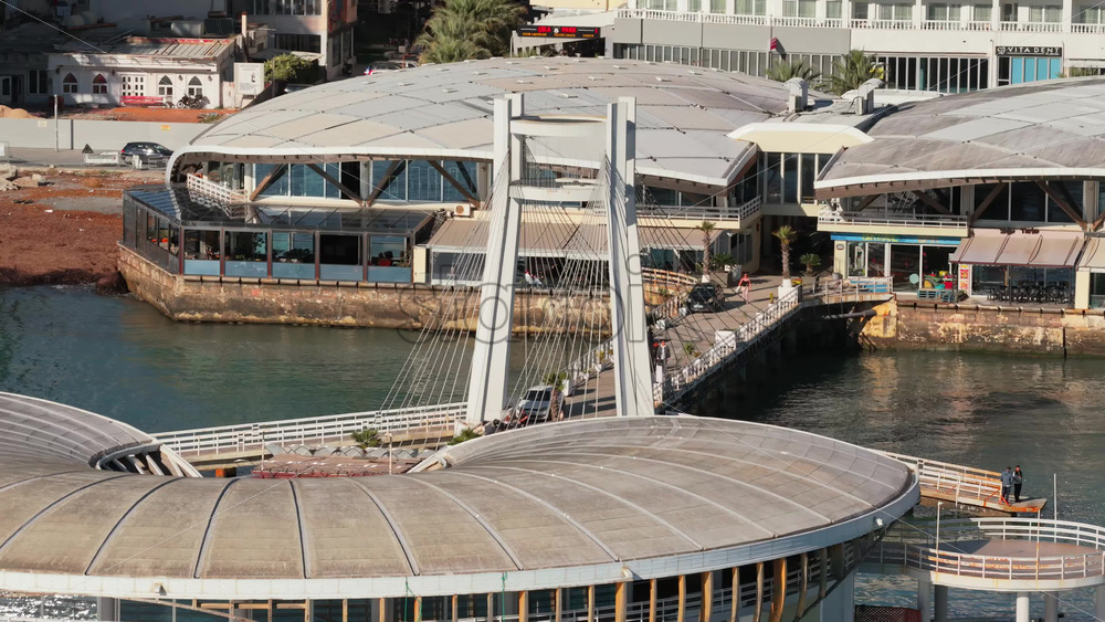 Aerial drone view of the futuristic white, sail shaped pedestrian and vehicular overpass near the port in Durres, Albania Royalty Free Stock Video Footage