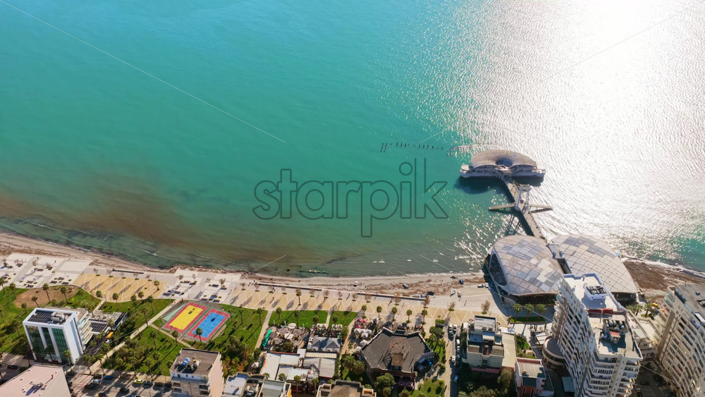 Aerial drone view of the Durres coastline showing tall apartment buildings, turquoise sea, and the uniquely shaped waterfront platform extending into the water Royalty Free Stock Video Footage