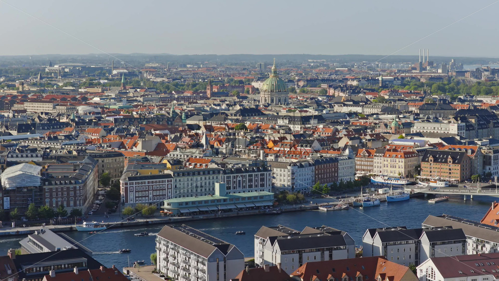 Video Aerial drone view of the Nyhavn waterfront, canal and entertainment district in Copenhagen, Denmark in the evening Royalty Free Stock Video Footage