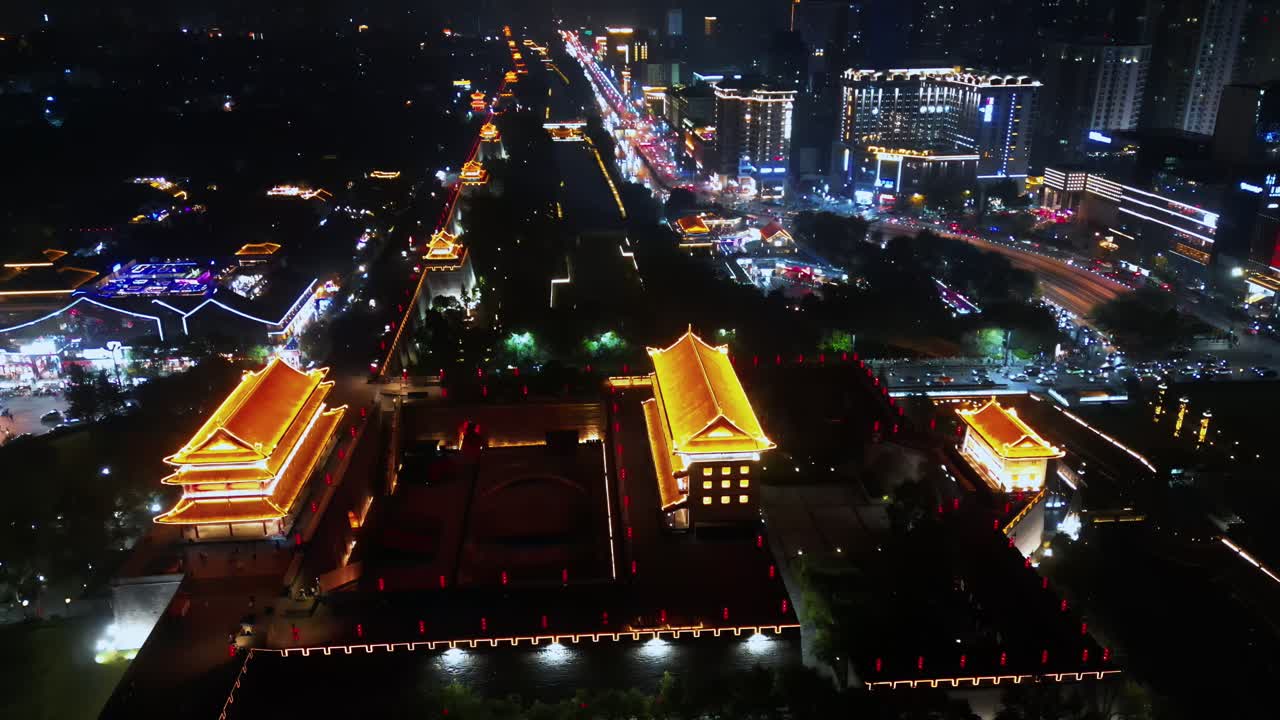 Aerial drone view of the illuminated Xi’an City Wall and Yongning Gate. Traditional Chinese architecture glows in warm golden light, surrounded by busy city streets and modern urban development Royalty Free Stock Video Footage