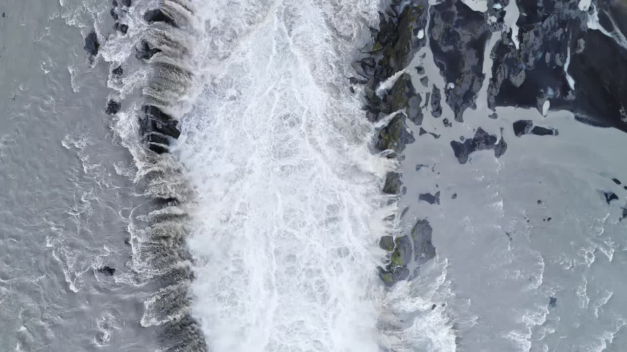 Aerial drone view of the immense curtain of water at Dettifoss waterfall. Turbulent whitewater surges over the cliff edge into a mist filled canyon Royalty Free Stock Video Footage