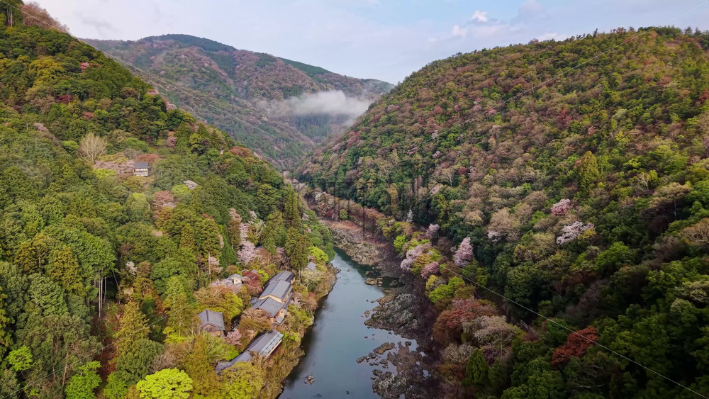 video Aerial drone view of the Katsura River in Arashiyama, Japan in daylight Royalty Free Stock Video Footage