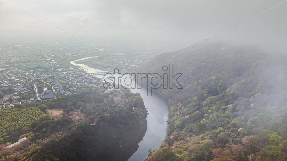 video Aerial drone view of the Katsura River in Arashiyama, Japan in daylight Royalty Free Stock Video Footage