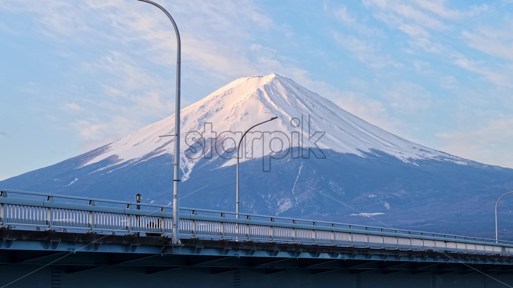 Aerial drone view of the Kawaguchiko-Ohashi bridge near the Fujikawaguchiko town in Japan with Mount Fuji on the background Royalty Free Stock Video Footage