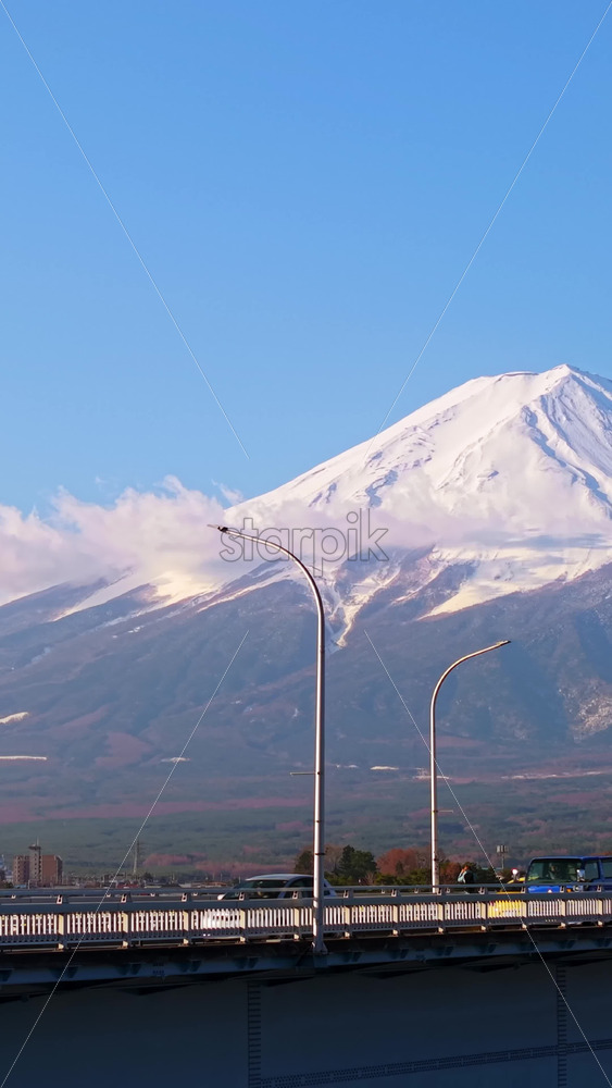 video Aerial drone view of the Kawaguchiko-Ohashi bridge near the Fujikawaguchiko town in Japan with Mount Fuji on the background. Vertical Royalty Free Stock Video Footage