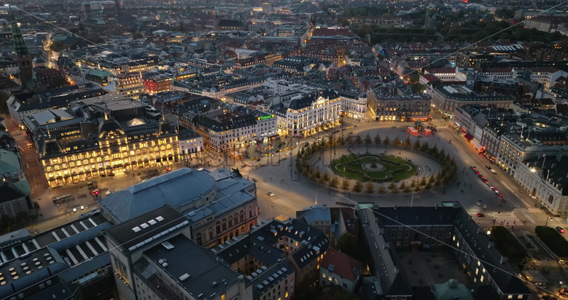 Video Aerial drone view of the Kongens Nytorv public square in Copenhagen, Denmark at night Royalty Free Stock Video Footage