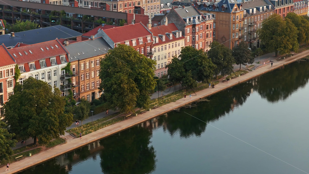 Aerial drone view of the lakeside apartments along Sortedams So with people walking by the water in Copenhagen, Denmark Royalty Free Stock Video Footage