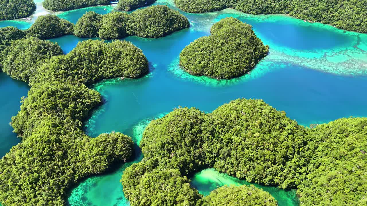 Video – Aerial drone view of the limestone islets and emerald lagoons of Coron Island, Palawan, Philippines. Dense tropical vegetation covers rounded karst formations surrounded by bright turquoise waters and coral reefs