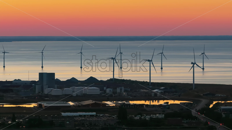 VIDEO Aerial drone view of the Middelgrunden wind farm outside Copenhagen, Denmark at sunset Royalty Free Stock Video Footage