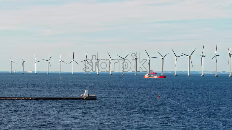 VIDEO – Aerial drone view of the Middelgrunden wind farm outside Copenhagen, Denmark Royalty Free Stock Video Footage
