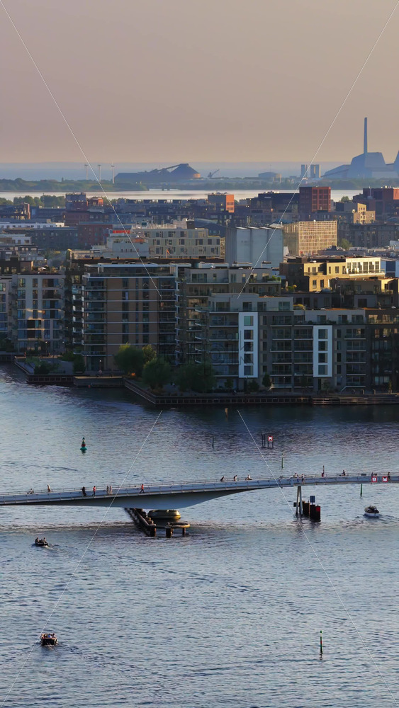 Aerial drone view of the modern Lille Langebro pedestrian and cycling bridge crossing Copenhagen’s inner harbor, with boats navigating the calm waters below. Vertical Royalty Free Stock Video Footage