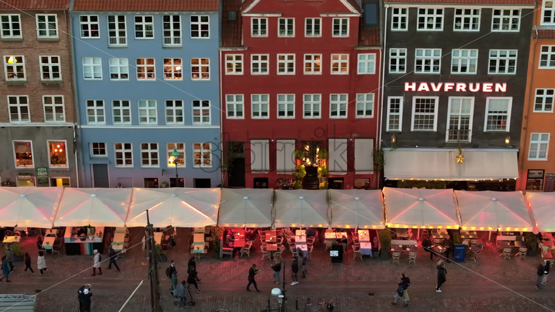 Video Aerial drone view of the Nyhavn waterfront, canal and entertainment district in Copenhagen, Denmark in the evening Royalty Free Stock Video Footage