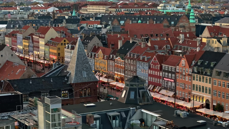 Home » Shop » 1 Video » Video Aerial drone view of the Nyhavn waterfront, canal and entertainment district in Copenhagen, Denmark in the evening