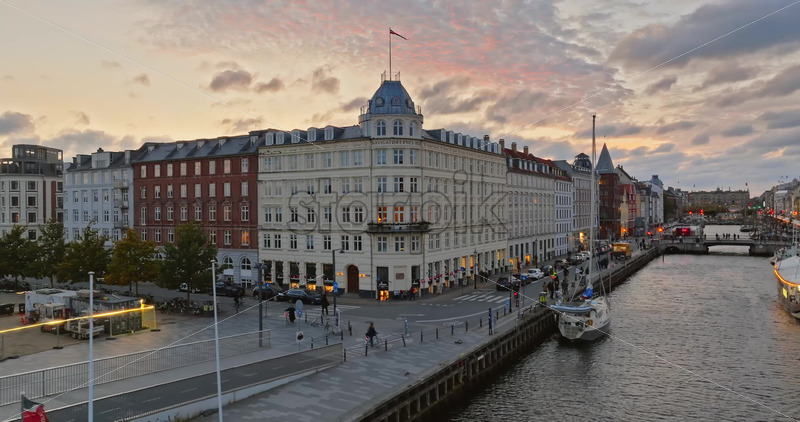 Video Aerial drone view of the Nyhavn waterfront, canal and entertainment district in Copenhagen, Denmark in the evening Royalty Free Stock Video Footage