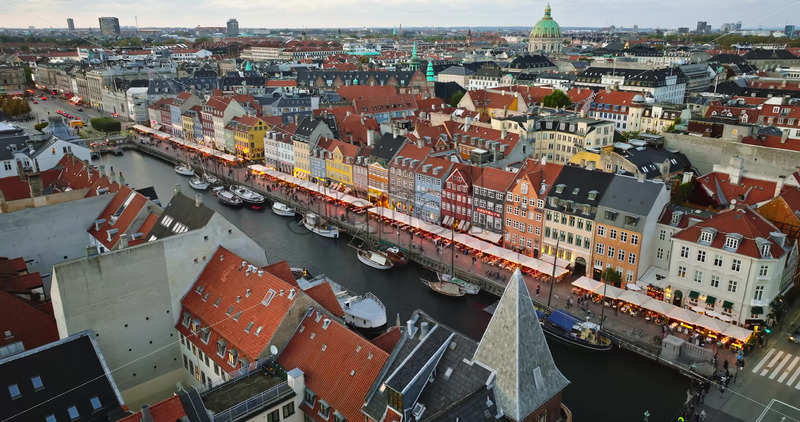 Video Aerial drone view of the Nyhavn waterfront, canal and entertainment district in Copenhagen, Denmark in the evening Royalty Free Stock Video Footage