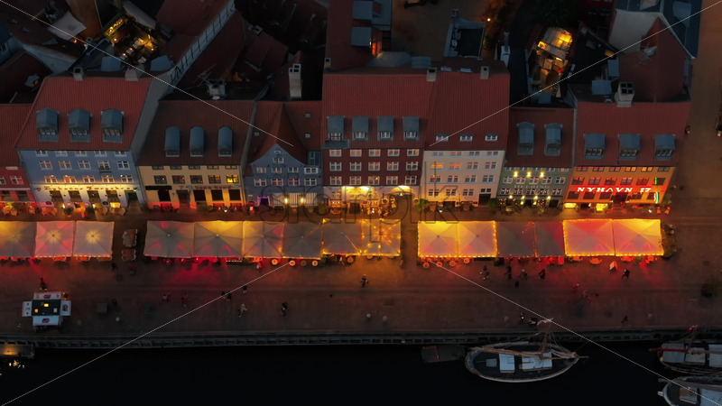 Video Aerial drone view of the Nyhavn waterfront, canal and entertainment district in Copenhagen, Denmark in the evening Royalty Free Stock Video Footage