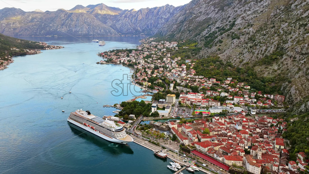 Aerial drone view of the old town, the port, and a cruise ship in the bay, framed by steep mountains and clear morning light in the bay of Kotor Royalty Free Stock Video Footage