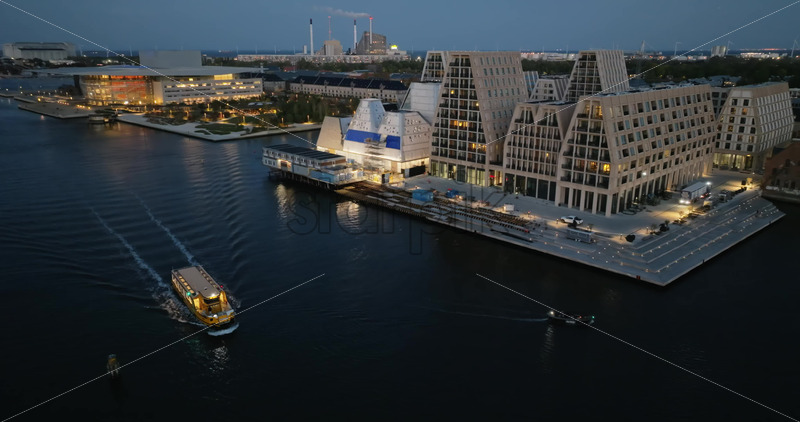 Video Aerial drone view of the Paper Island urban oasis surrounded by water in Copenhagen, Denmark at night Royalty Free Stock Video Footage