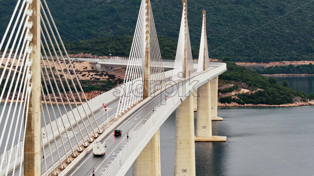 Aerial drone view of the Peljesac Bridge near Komarna, Croatia, partially shrouded in low coastal fog with mountains in the background Royalty Free Stock Video Footage