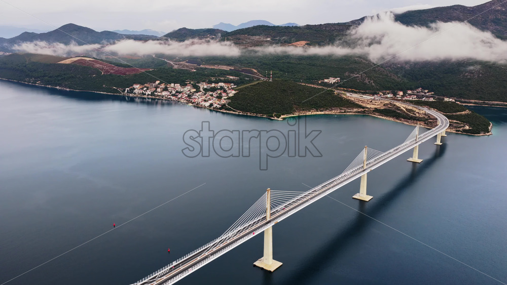 Aerial drone view of the Peljesac Bridge near Komarna, Croatia, partially shrouded in low coastal fog with mountains in the background Royalty Free Stock Video Footage