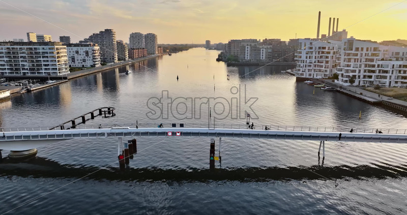 Video Aerial drone view of the Quay Bridge across the port of Copenhagen, Denmark at sunset
