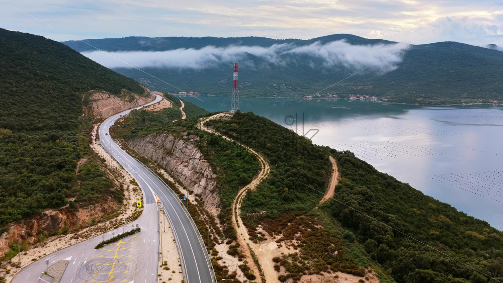 Aerial drone view of the scenic coastal area around Peljesac Bridge, Croatia, featuring winding roads, dense green hills, oyster farms in the water, and fog rolling over the mountains Royalty Free Stock Video Footage