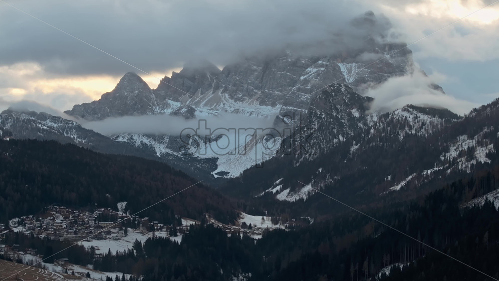 Aerial drone view of the Selva di Cadore commune surrounded by the Dolomites mountains in Italy Royalty Free Stock Video Footage